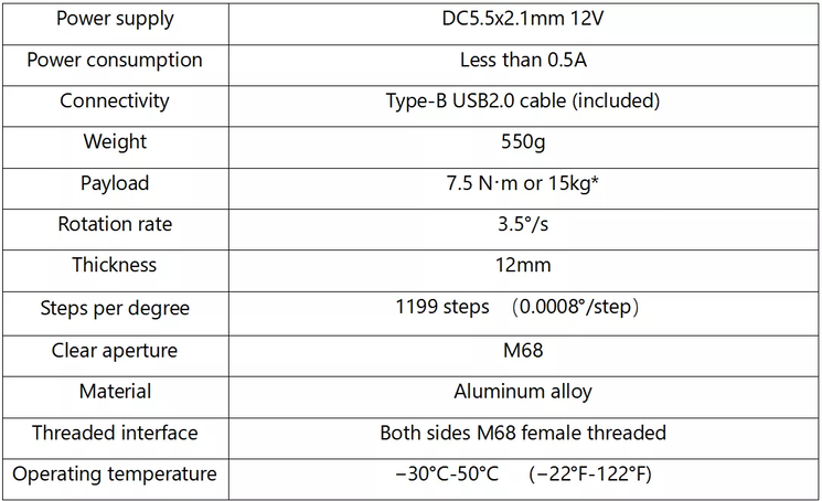 Le dispositif mécanique est léger et mince. Le WandererRotator v2 a un back focus de seulement 10 mm dans la version Mini et de 16 mm dans la version Pro, ce qui le rend facile à intégrer dans votre équipement photographique. De nombreuses combinaisons sont possibles, y compris un aplanisseur de champ ou un réducteur de focale. Nous vous recommandons de consulter le guide de montage édité par WandererAstro, qui détaille les combinaisons possibles en fonction de votre instrument et de vos accessoires. En termes de poids, la version Mini (M54) ne pèse que 420g, tandis que la version Pro (M92) pèse 800g.