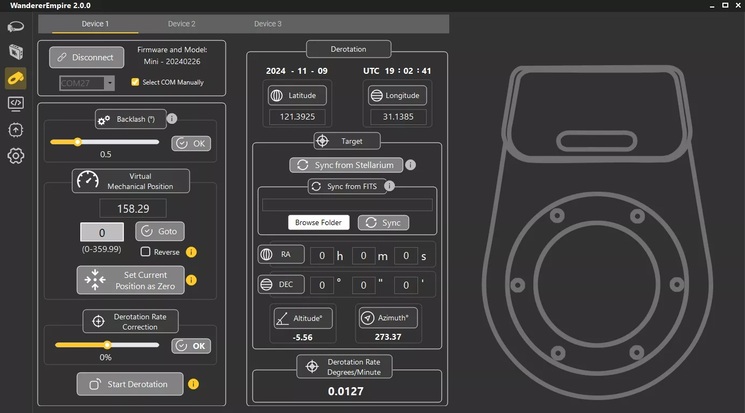 La rotation du champ est un phénomène inhérent aux instruments montés en position altazimutale (par exemple, les télescopes Dobsoniens ou Schmidt-Cassegrain montés sur fourche). Dans ce type de monture, contrairement à une monture équatoriale, le suivi automatique des objets célestes entraîne une rotation du champ de vision au point focal du télescope ; le champ semble tourner lentement sur son axe pendant la nuit. Wanderer v2 compense automatiquement cette rotation du champ. Il est donc possible de photographier le ciel avec des temps d'exposition plus longs en utilisant des instruments avec une monture altazimutale motorisée, tout comme avec une monture équatoriale.
