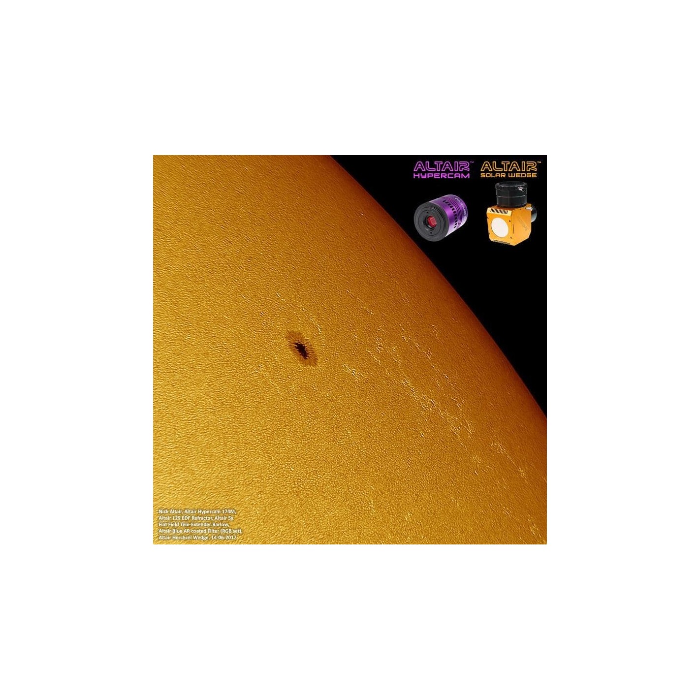 Le prisme Altair Solar de Herschel est "prêt pour l'imagerie" car vous pouvez ajuster précisément la luminosité de l'image sans démonter l'appareil photo afin d'obtenir les meilleurs réglages d'exposition, de gain et de contraste. C'est l'idéal pour les caméras CMOS à "image chanceuse" telles que les séries Altair Hypercam ou GPCAM. L'utilisation de filtres tels que Altair G-Band, Altair 540nm Continuum et Altair NUV est facilitée par le contrôle de la luminosité.