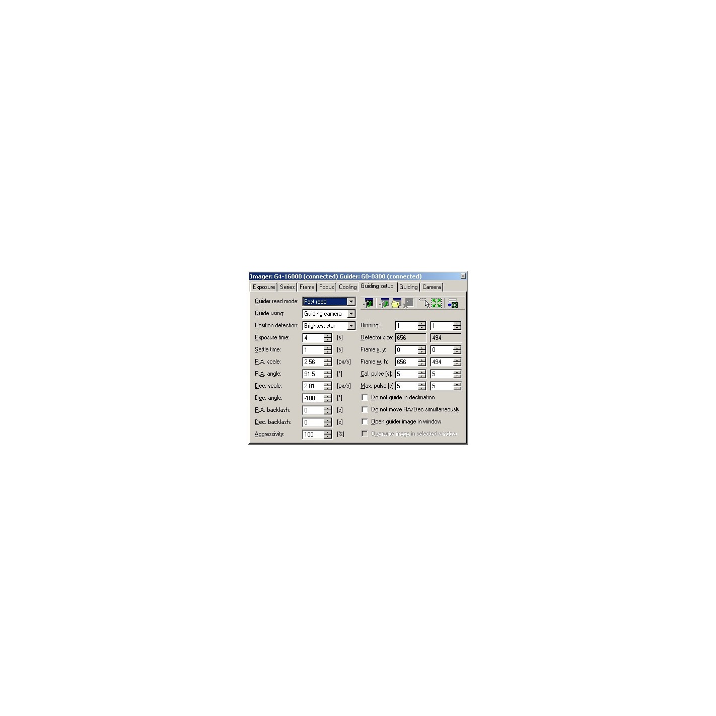 - Guidage sur une seule étoile. Le PC calcule le centroïde de l'étoile la plus brillante dans l'image acquise par la caméra du guide. La position du centroïde est calculée avec une précision de quelques fractions de pixel, de sorte que le guidage peut être très précis même lorsque le guide est fixé à un télescope à courte focale.