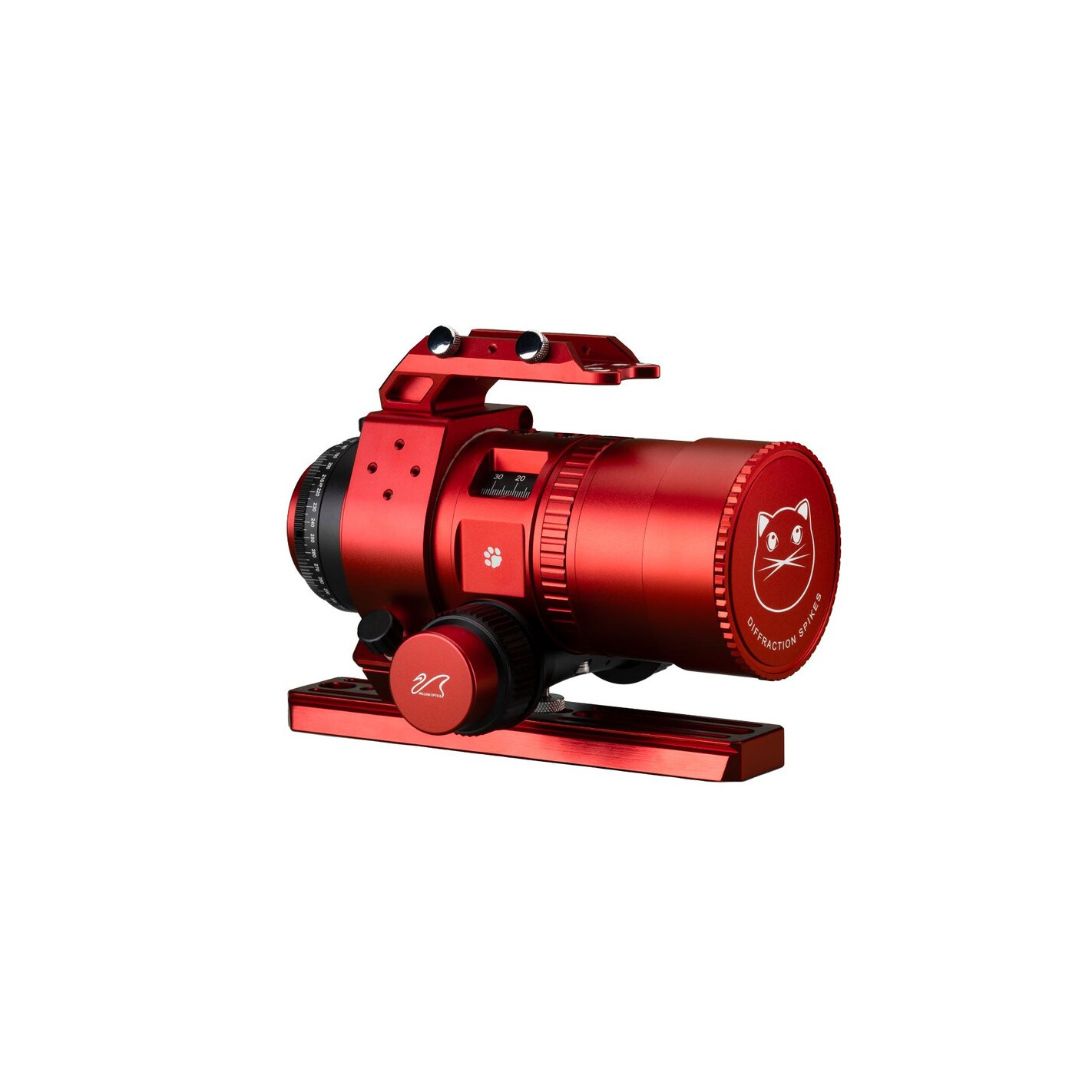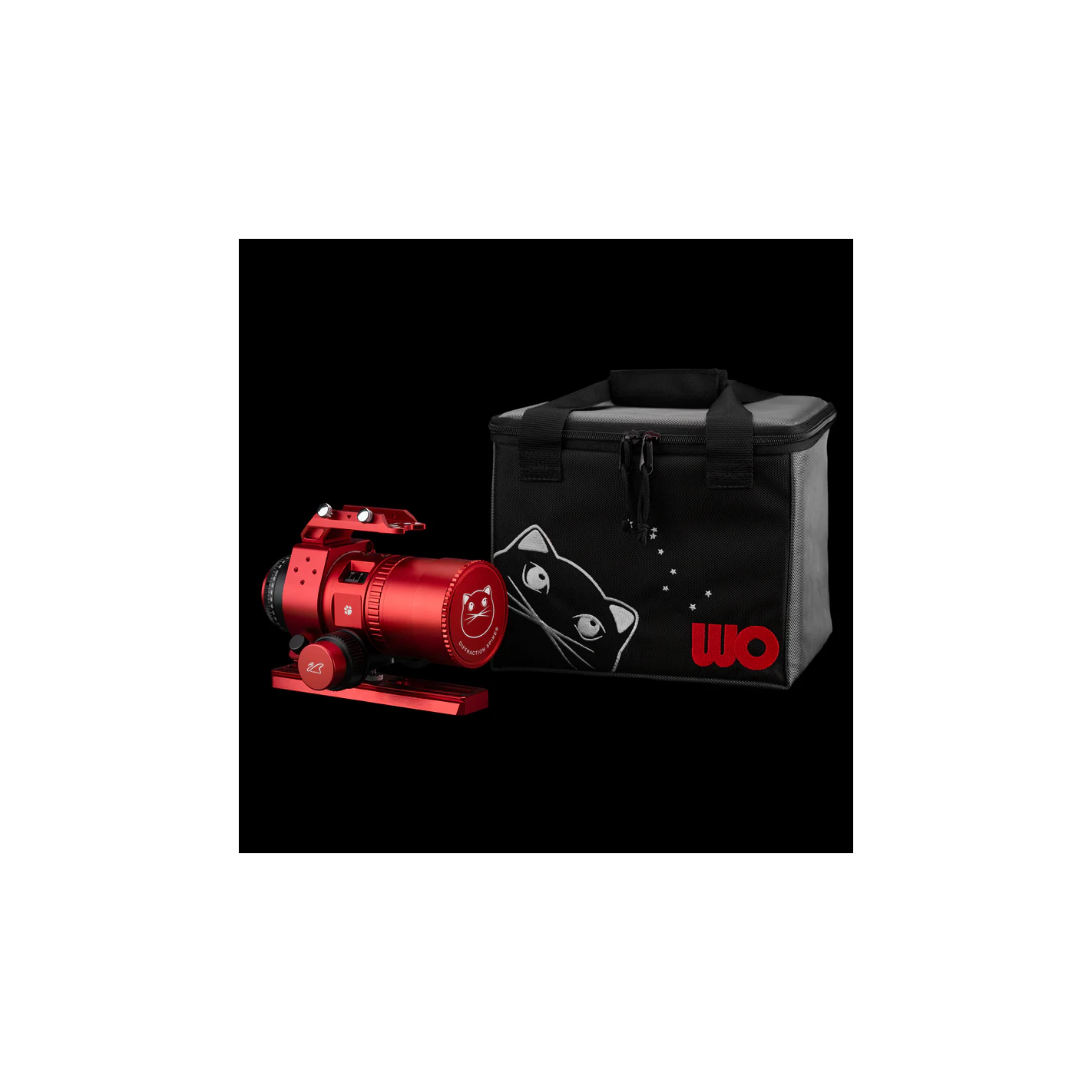 Grâce à la très courte longueur du tube et à son faible poids de seulement 1,67 kg, le MiniCat est un apochromatique parfait pour les voyages et les petites montures de caméra, telles que le SkyGuider de iOptron. Il est équipé d'un filetage M48 pour la fixation de l'appareil photo. Vous trouverez des adaptateurs T2 appropriés dans la rubrique "Accessoires recommandés". La livraison comprend non seulement un étui de protection en nylon, mais aussi un masque Bahtinov spécialement conçu. Ce masque facilite la mise au point et est intégré à la monture de l'objectif.