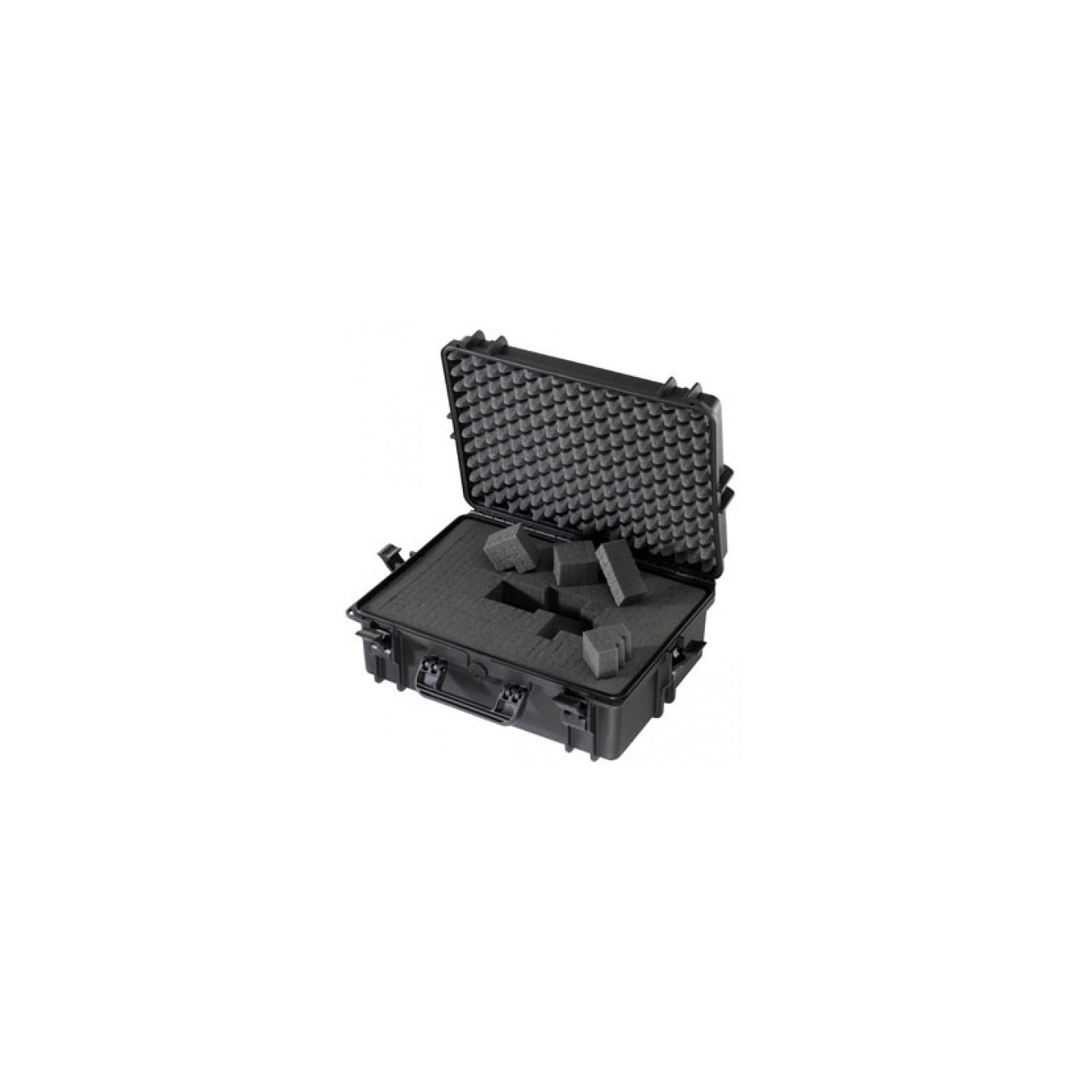 Mousse découpée à l'emporte-pièce Geoptik pour faire entrer votre matériel dans les valises de transport étanches équipées de grandes roues.